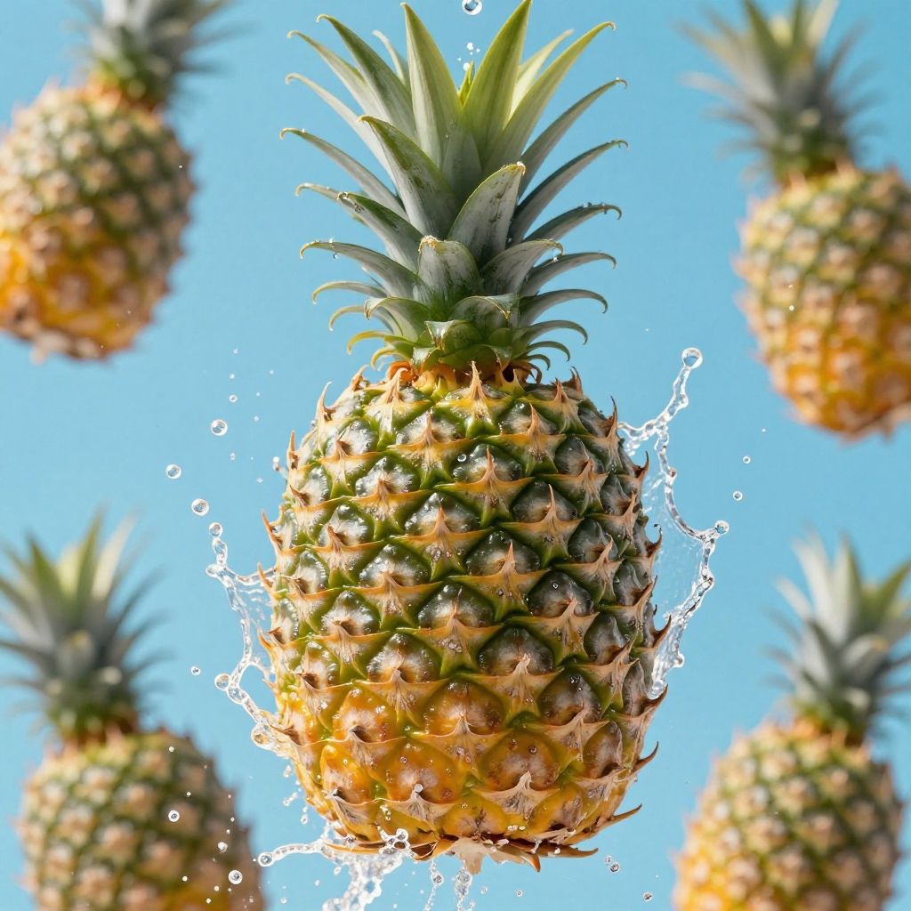 No humans, Photographic, fruit, pineapple, water splashing, splashing, multiple others, realistic, Bubbles, blur, fruit poster, bule background