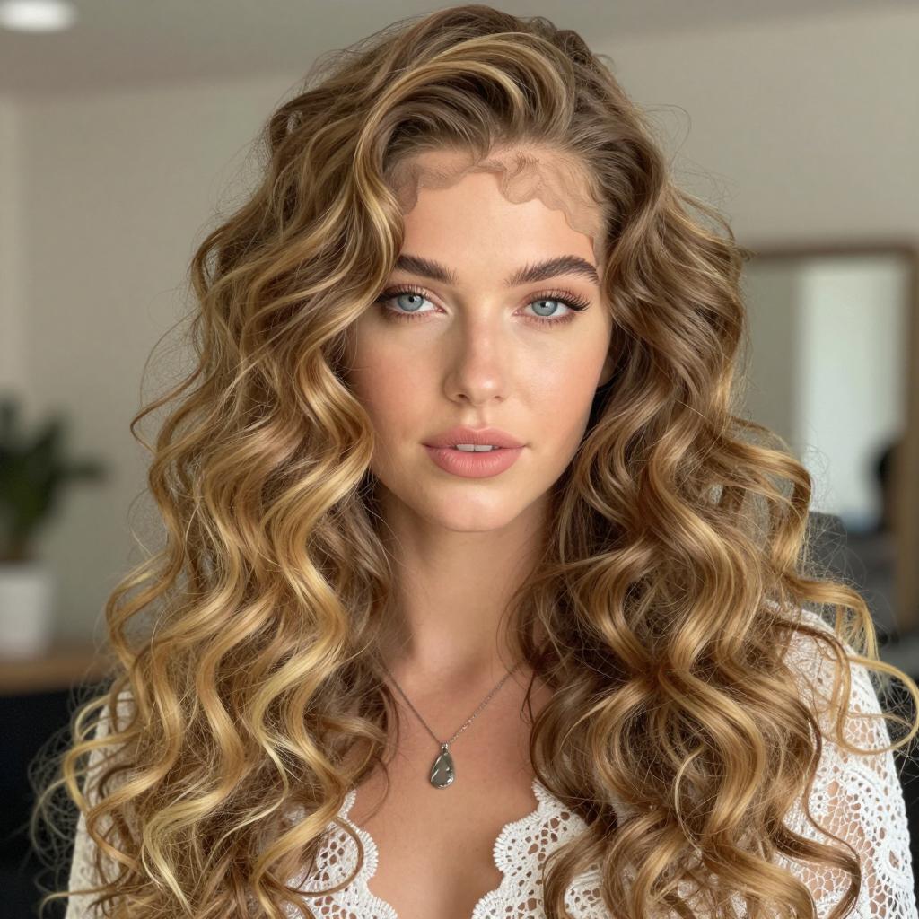 Photorealistic close-up portrait of a beautiful young woman wearing a lace frontal curly wig with multi-toned blonde and brown hair. She has light blue eyes, soft makeup, and smooth skin. She wears a white lace top and a silver necklace with a teardrop pendant. The background features a soft bokeh effect and neutral indoor setting, with soft lighting enhancing her elegant and confident expression.