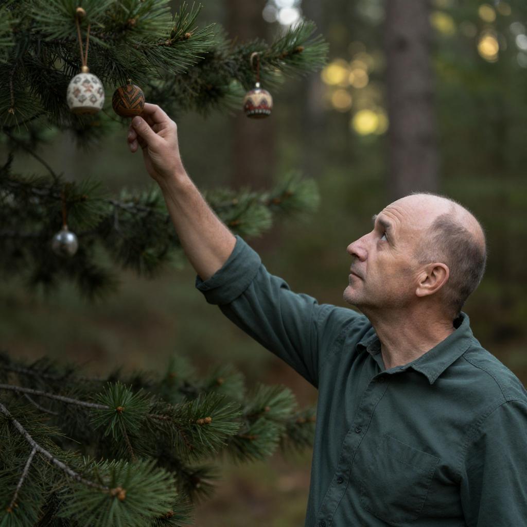 Photograph of a middle-aged man with balding head, wearing a dark green shirt, standing in a forest. He reaches up with his right hand to touch a pine tree with multiple small, patterned ornaments hanging from it. Forest background with sunlight filtering through trees. Man's expression is focused.