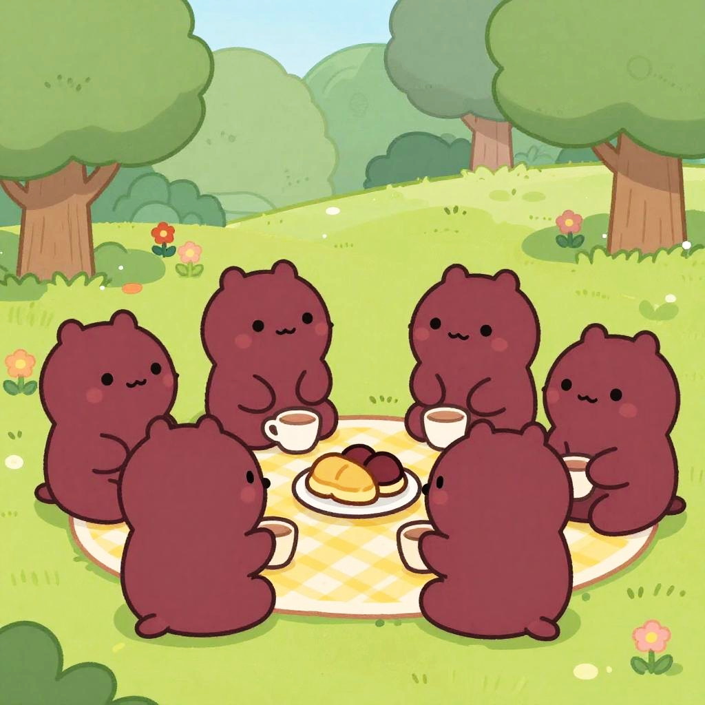 Black chibi characters in a cozy indoor scene, sitting around a wooden table playing games, warm lighting, cozy details like books and snacks, cute and round forms with joyful expressions, colorful and inviting environment with soft shadows.