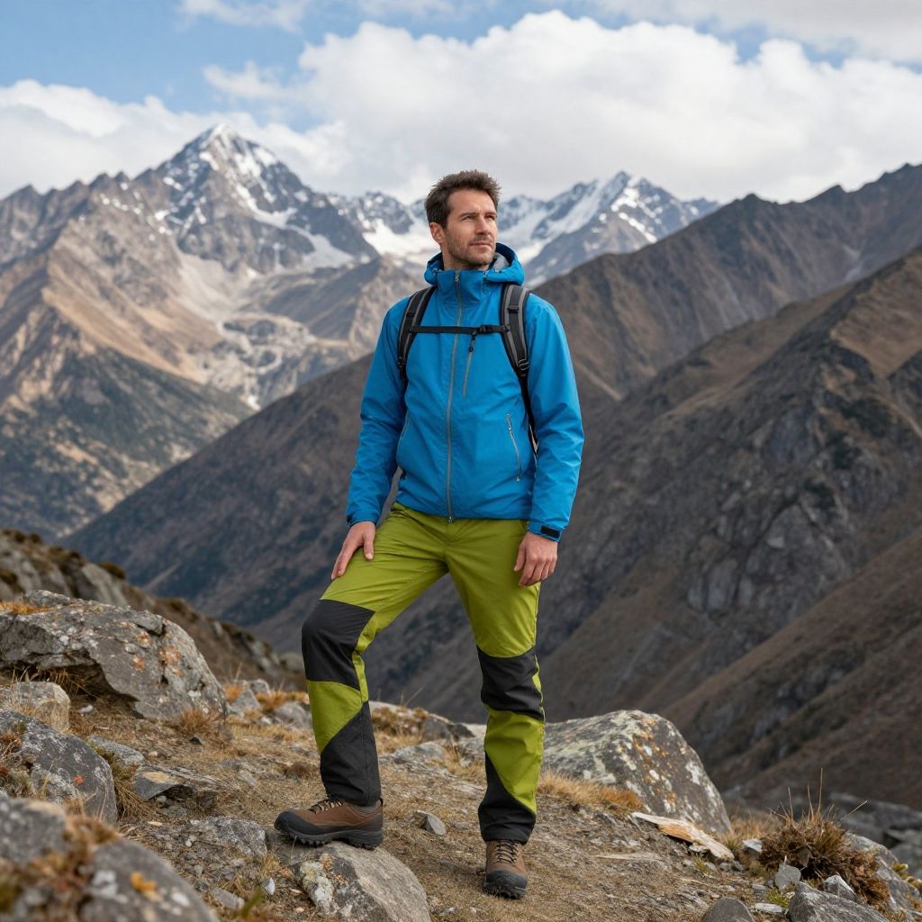 A man stands confidently in a vibrant blue jacket and green pants, surrounded by breathtaking mountain scenery. His adventurous spirit is evident as he prepares for an outdoor expedition, highlighted by the rugged terrain and stunning backdrop of peaks.