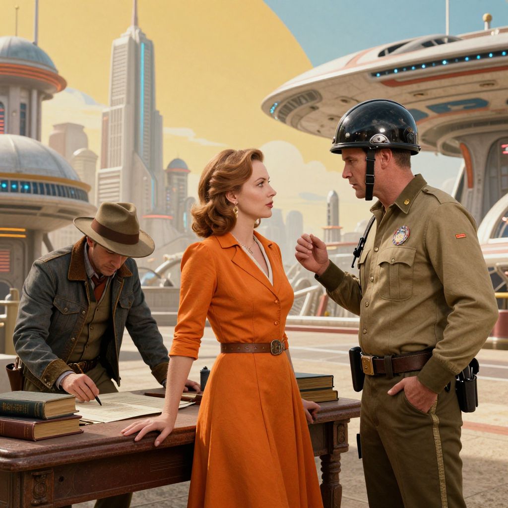 In this highly detailed Western retrofuturistic scene, three individuals are engaged in various activities. A woman in an orange dress stands in the foreground, her gaze directed towards a man in a helmet and uniform, who appears to be discussing something with her. To the left, another man in a hat and jacket is focused on a task at a table, surrounded by books and documents. The background features a futuristic cityscape with tall buildings, domes, and a large, sleek spaceship, all rendered in a vibrant palette of yellows, oranges, and blues. The overall composition is dynamic, with the characters and objects arranged in a way that creates a sense of depth and movement, capturing the essence of a bustling, technologically advanced society.