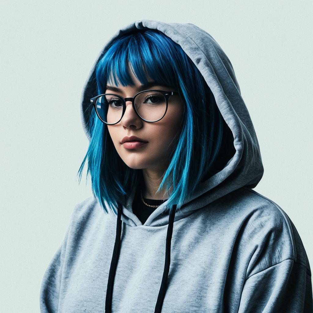 Masterpiece, best quality, 1girl, blue hair, medium hair, hoodie, hood up, glasses, jewelry, simple background
