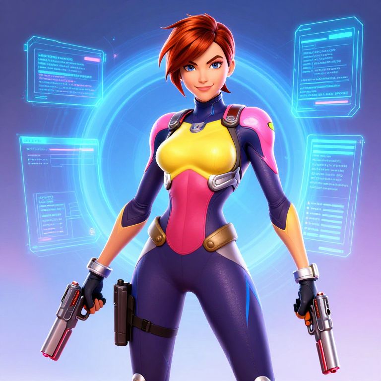 This is a digital CGI image of a confident, attractive woman with short, red hair and blue eyes. She wears a form-fitting, futuristic bodysuit with a yellow chest panel, pink midsection, and dark blue sleeves and legs. She holds two silver handguns in her gloved hands. The background features a glowing blue circular holographic interface with floating, neon text panels. Her outfit includes a belt with pouches, and her stance is strong and assertive. The style is vibrant and high-tech, reminiscent of video game or comic book art.