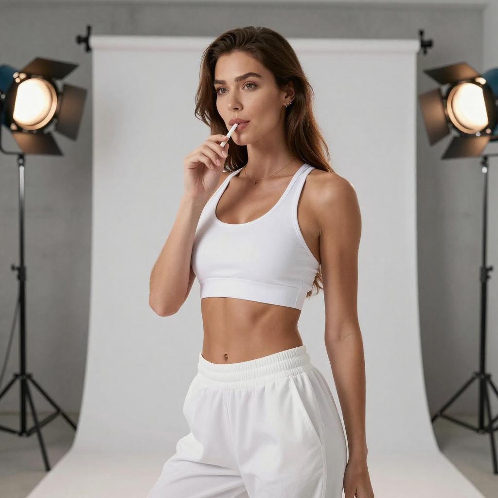 Photograph of a slender, tan-skinned woman with long brown hair, wearing a white sports bra and loose white pants, sipping from a straw. She stands in a modern studio with gray concrete walls, white backdrop, and two large studio lights. She has a toned, muscular abdomen and is looking slightly to the side.