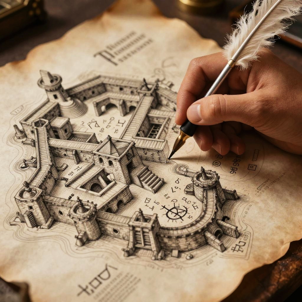 Close-up of a Dungeons & Dragons map maker's hand sketching a detailed dungeon map with ink and quill, fantasy symbols and terrain features emerging on parchment, warm atmospheric light, medieval fantasy style, creative and immersive
