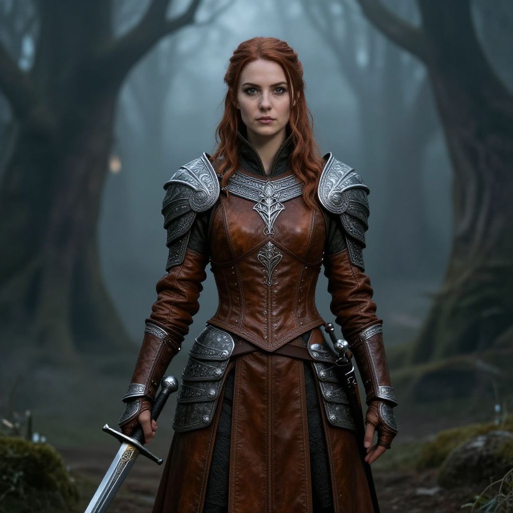 Photorealistic digital artwork of a determined, fair-skinned woman with long, wavy red hair standing in a misty forest. She wears ornate, silver-embellished brown leather armor with matching gauntlets and a high-necked tunic. Her brown leather skirt has silver detailing and she holds a sword in her right hand. The background features tall, dark tree trunks and a bluish-gray mist. The woman's intense gaze and poised stance exude strength and readiness. The forest setting adds an eerie, mystical atmosphere to the image.