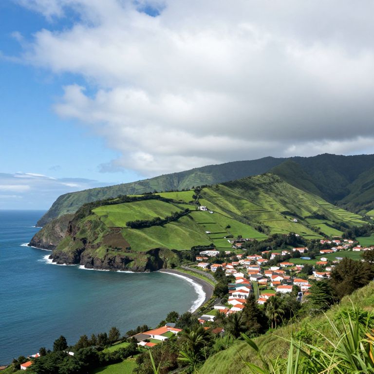 São Miguel's coastal landscape showcases a serene blend of lush green hills, a vibrant village nestled near the shoreline, and a majestic mountain rising under a partly cloudy sky, inviting visitors to explore its natural beauty and cultural charm.