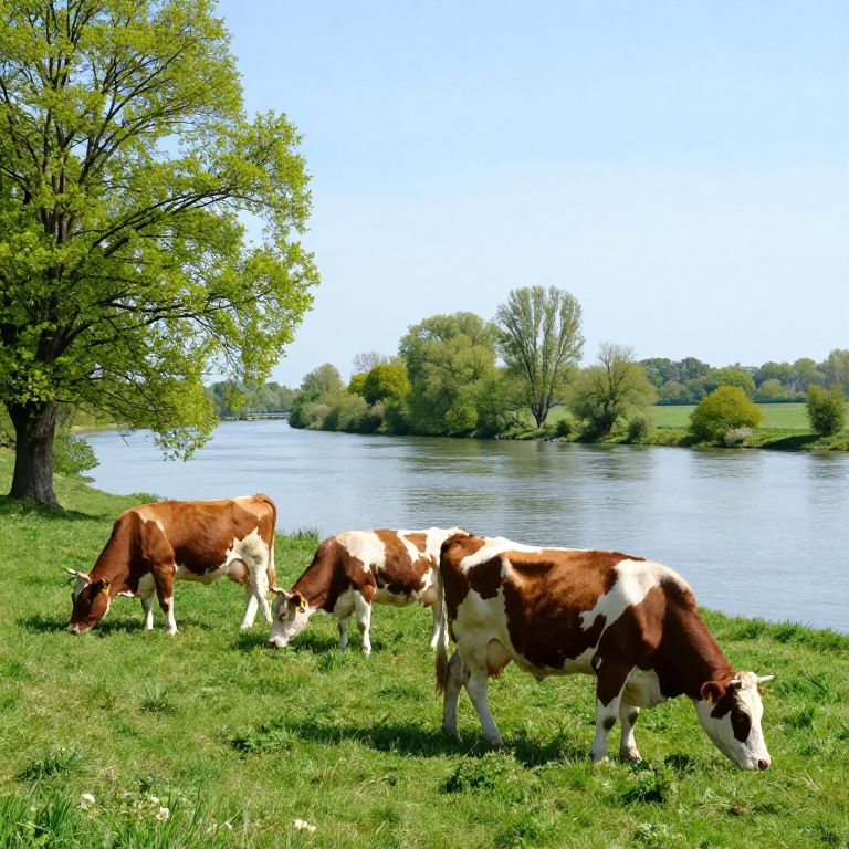 Cows graze peacefully on lush green grass near the tranquil banks of the Seine at Saint-Mammès, with vibrant spring foliage and a serene landscape stretching into the horizon.