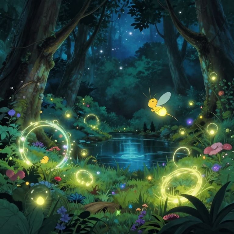 Imagine a whimsical dreamscape inspired by the enchanting worlds of Studio Ghibli, where a lush and vibrant forest floor is intricately woven with ethereal fairy rings glowing softly with bioluminescent light. From the perspective of an enchanting firefly, capture the serene beauty of this nocturnal realm as it hovers gently above a tranquil pond reflecting the starlit sky. This captivating image seamlessly blends wonder and tranquility, creating an immersive experience that transports the viewer into a world teeming with magical creatures and mystical landscapes.