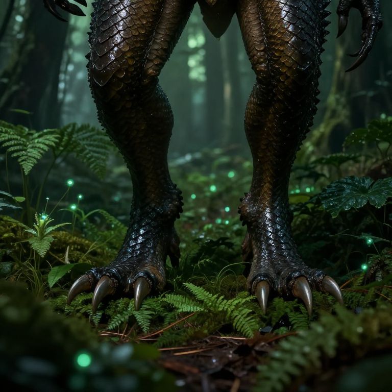 A digital CGI image depicts the lower legs and feet of a dark, scaly, reptilian creature standing in a dense, mystical forest. The creature's legs are muscular with textured, dark brown scales, and it has sharp, metallic claws on each foot. The forest floor is covered in green ferns and moss, with glowing, ethereal green fireflies scattered throughout. Tall, shadowy trees loom in the background, creating a dim, enchanted atmosphere. The creature's stance is formidable, suggesting a sense of power and readiness. The image has a high level of detail and realism in both the creature's anatomy and the forest environment.