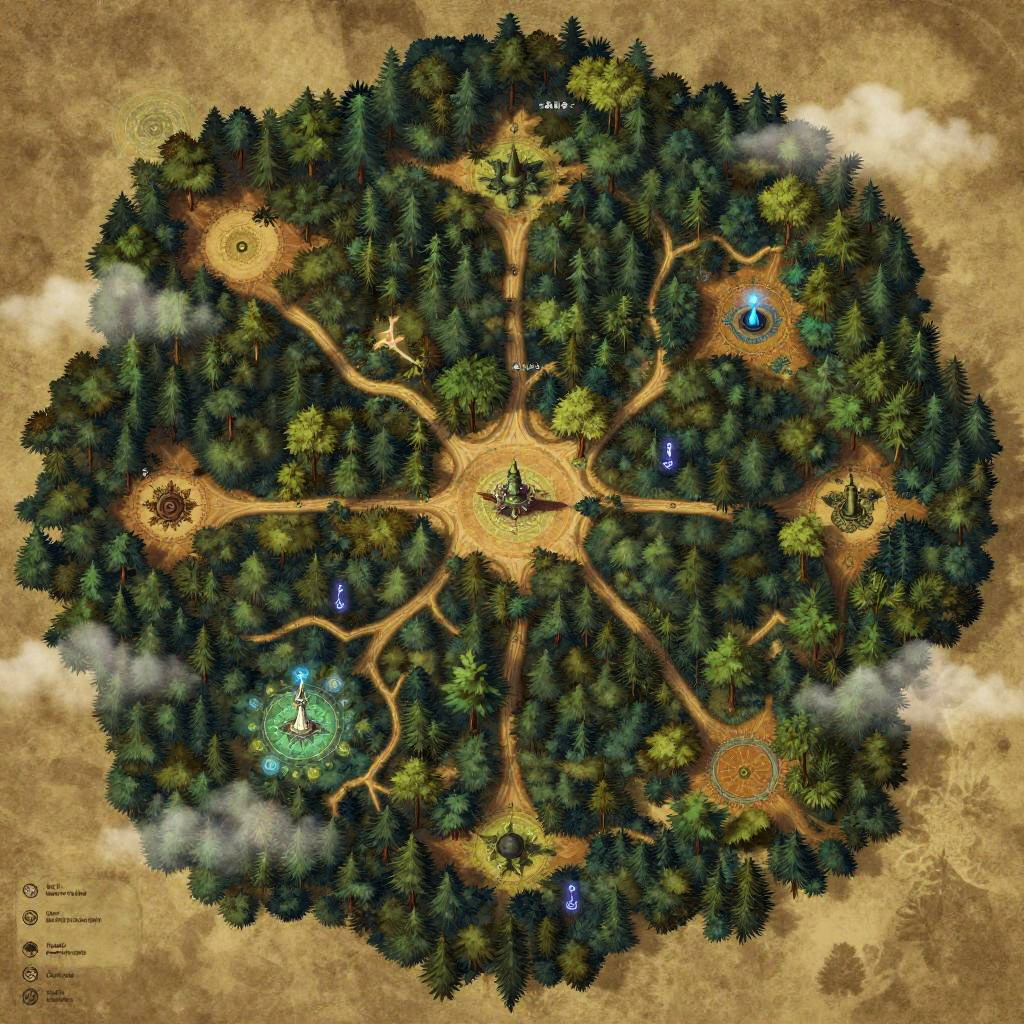 Dnd large forest map featuring a complex network of forest paths, magical landmarks like druid circles and hidden altars, dense canopy coverage with occasional clearings, rendered in warm earthy tones with fantasy map symbols and atmospheric mist effects