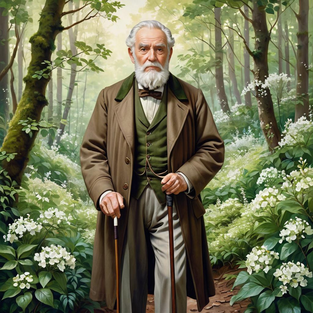 A realistic portrait of an elderly man with a beard standing in a dense forest surrounded by green foliage and white flowers, wearing a brown coat and gray suit, holding a walking cane, classic 19th century realism style, natural earth tone colors with green and brown hues