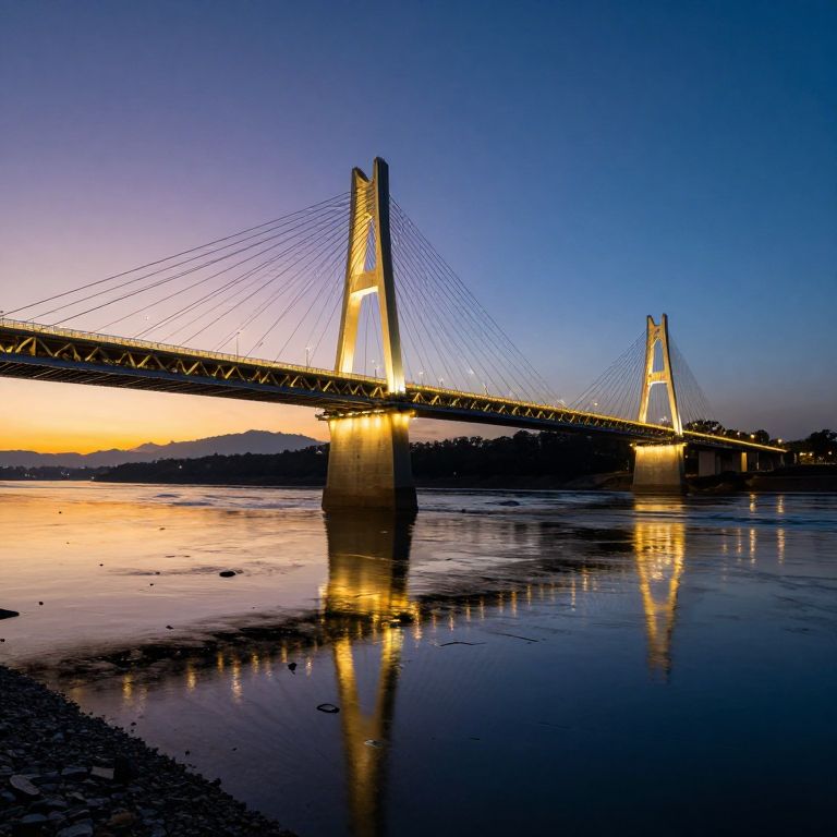 A luminous bridge spans a river of fractured mirrors, reflecting a surreal divide where one side bathes in radiant sunrise while the other plunges into deep twilight, creating a mesmerizing interplay of light and shadow.
