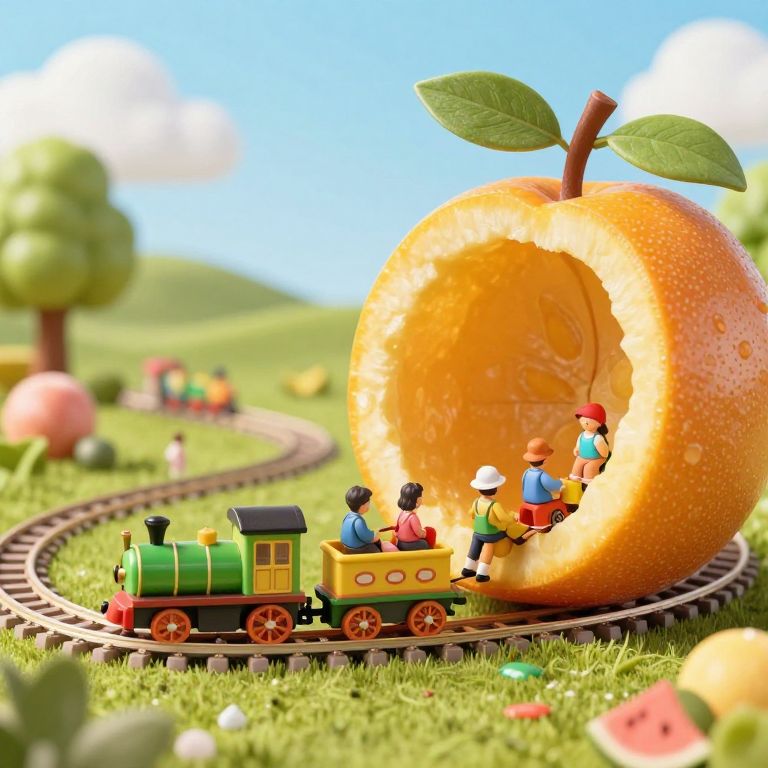 A whimsical scene where a miniature toy train chugs along the inner rim of a hollowed-out fruit, ferrying tiny passengers on an enchanting journey through a surreal, edible landscape.