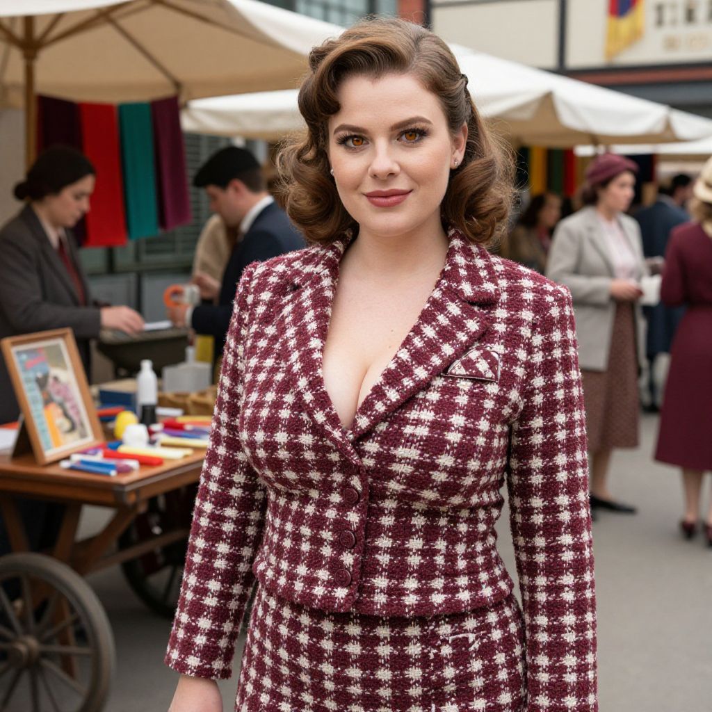 A confident woman with warm amber eyes, a full face, and a faint smile stands in a bustling 1940s-themed market, dressed in a striking tweed outfit woman costume — a checked maroon and cream tweed suit with a matching pocket square. The setting includes vintage vendors, colorful fabrics, and a small wooden cart with hand-crafted crafts, capturing the lively charm of retro fashion. The woman has big tits and cute face