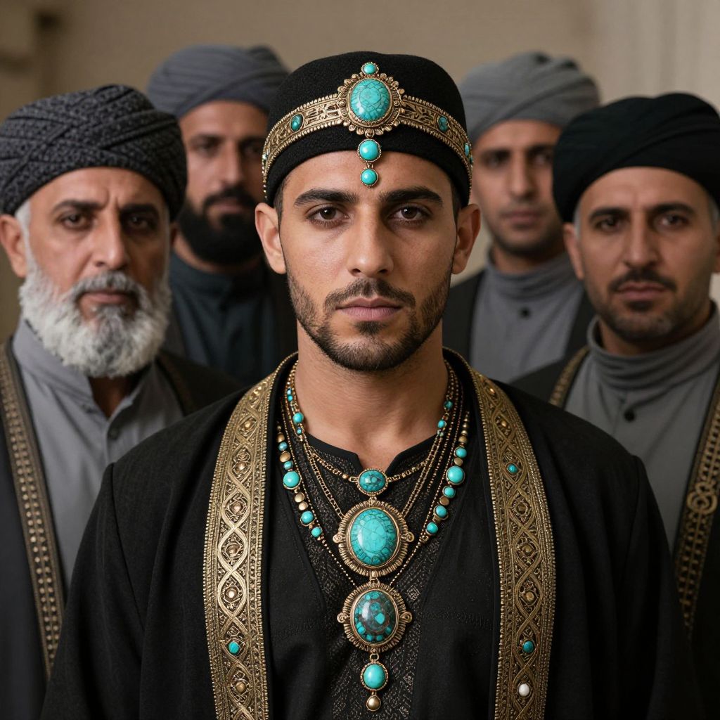 A realistic portrait of the brave thief of ancient jewels in cape by hassan tabrizi, gray men, bright-turquoise and bronze colour scheme, perfect faces, dark