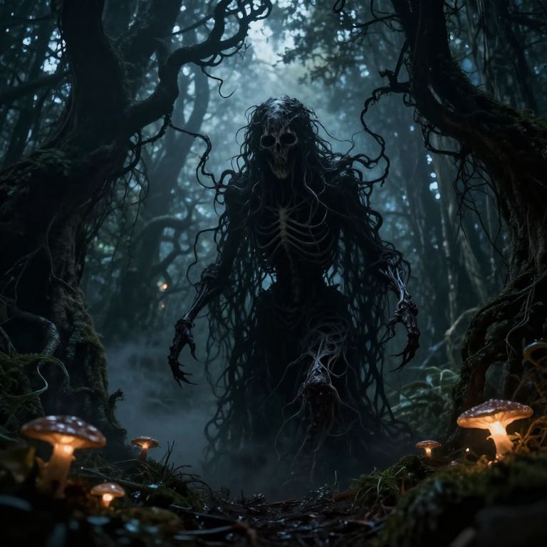 Dark scary figure hidden in the shadows of a dense, twisted forest at night, skeletal frame with writhing tendrils and hollow eyes, supernatural horror vibe, detailed eerie environment with glowing fungi and creeping mist.