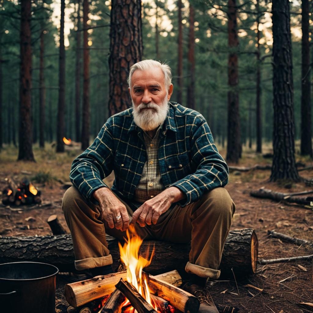 An elderly man with a full white beard wearing a cozy knit sweater sitting on the ground covered with dry autumn leaves in a mountain meadow sprinkled with wildflowers, soft natural lighting, relaxed and peaceful mood, shallow depth of field, muted greens and soft purples, hyper-realistic, 8K resolution