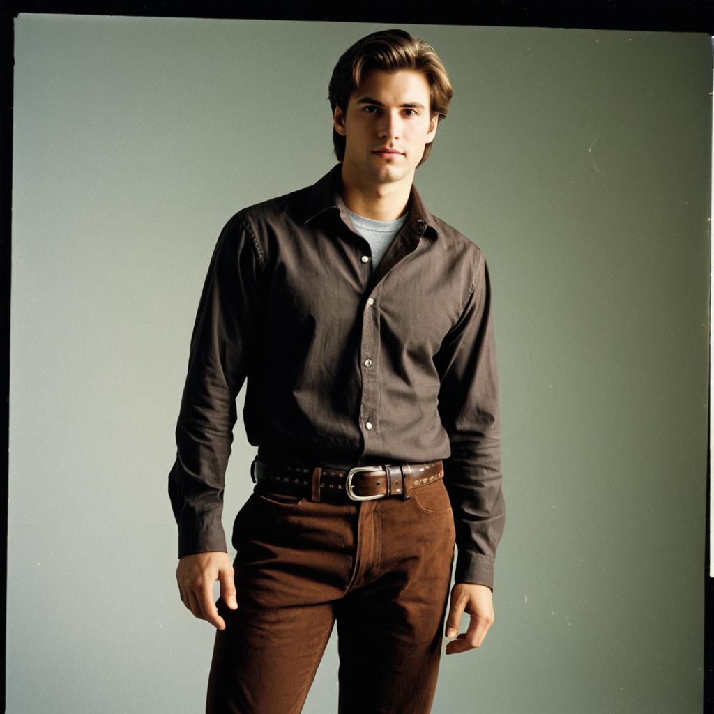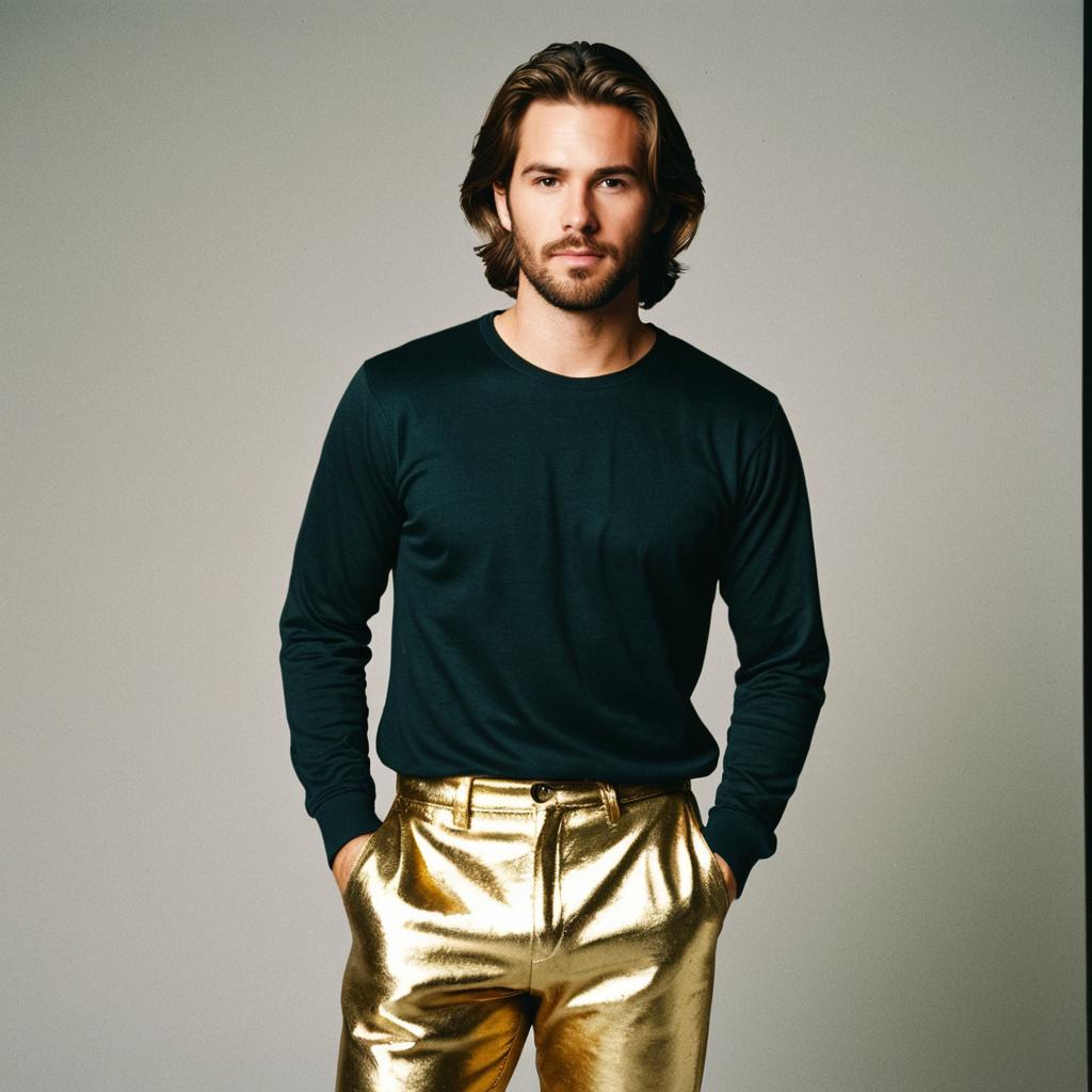 Gold lame pants man,1boy, male focus, solo, realistic, facial hair, shirt, brown hair, looking at viewer, long sleeves