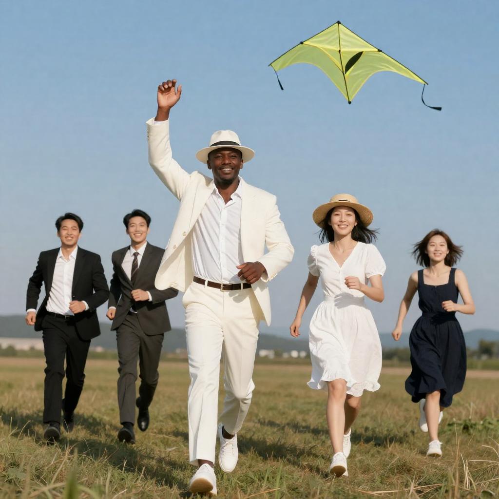 Group photo of diverse people in winter clothes, smiling. Central couple, bald black man and dark-haired Asian woman, hugging. Background people, mixed ages, wearing hats and scarves. Christmas decorations blurred in background. Foreground man in green cap. Warm, festive atmosphere.