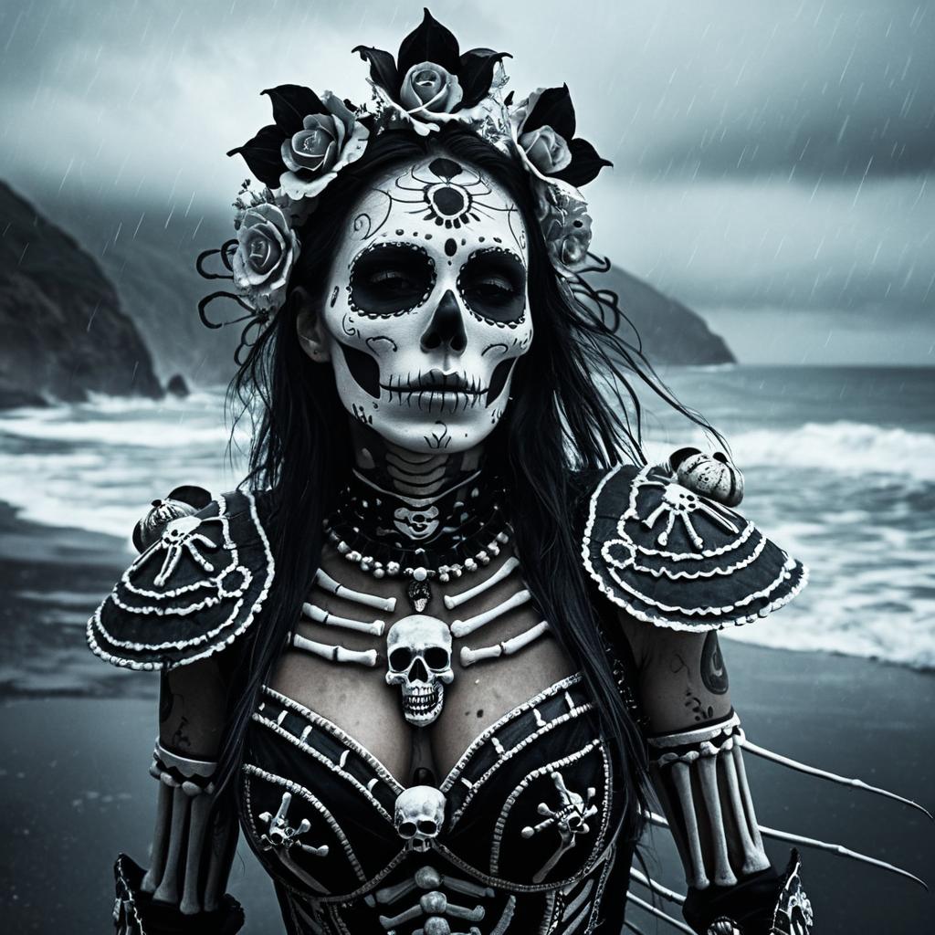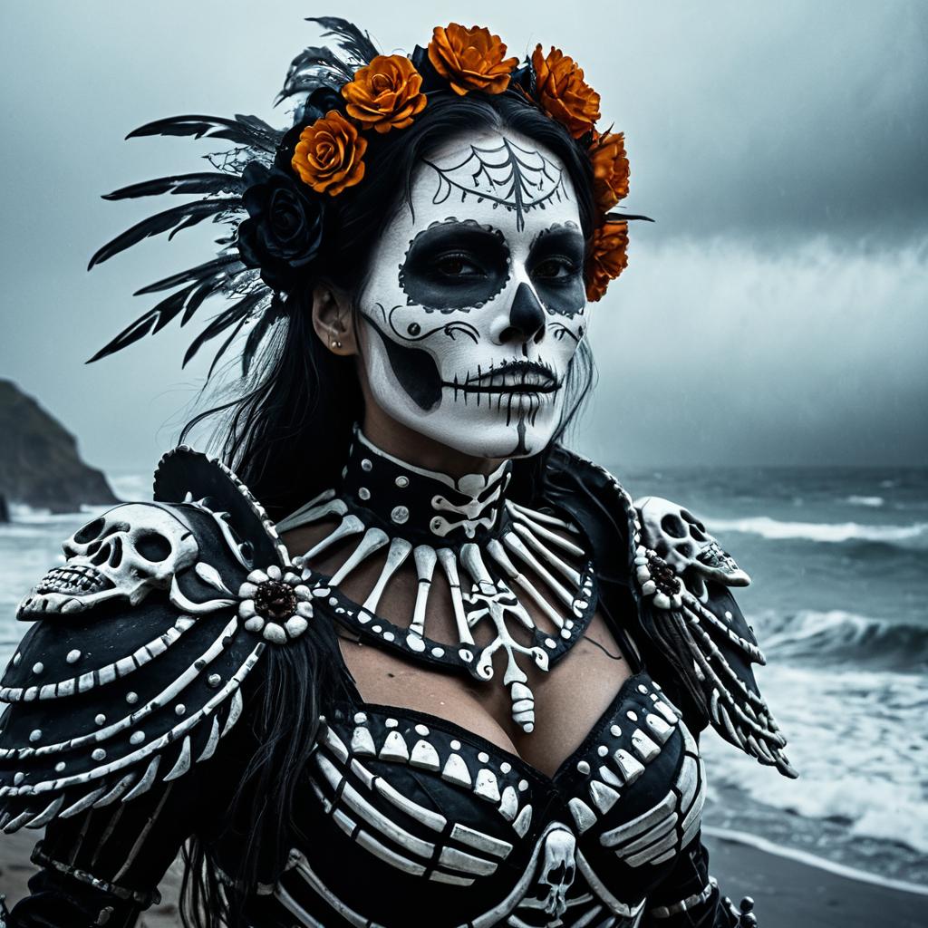 Portrait of a woman with la Catrina-inspired skull face paint, wearing intricate black and silver skeletal armor with detailed wing-like shoulder pieces and a skull necklace, standing on a stormy beach with waves and fog in the background. The image features hyperrealistic and cinematic lighting emphasizing the dark, ethereal atmosphere.