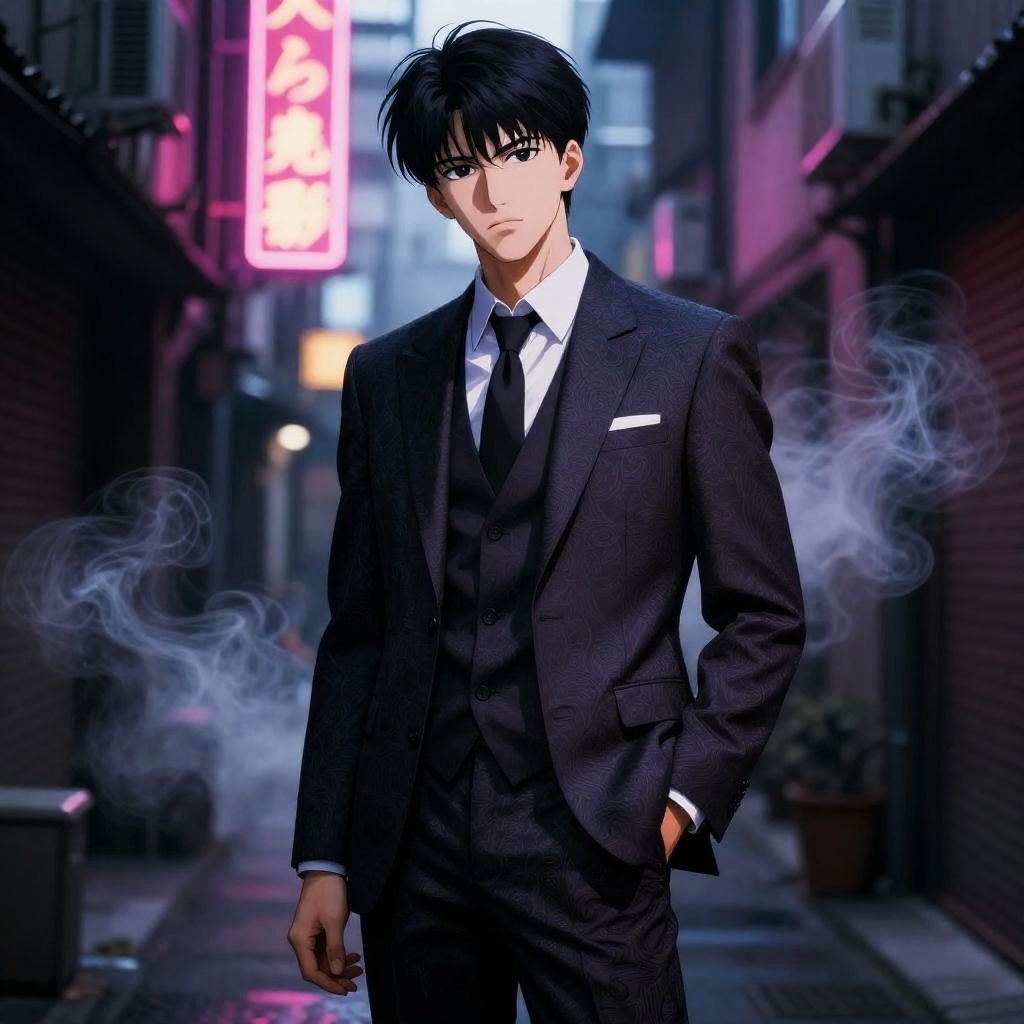 Realistic photo.a nostalgic demon, wearing a tailored suit with intricate patterns, standing in a shadowy alley with neon lights, surrounded by swirling smoke, illustrated in the romantic and ethereal manga style of Moto Hagio. realistic photo