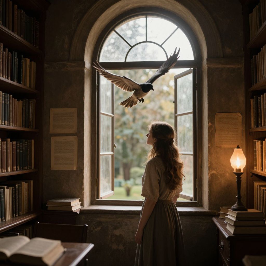 In a hushed library where sunlight filters through arched windows, a woman stands at the threshold of knowledge, her gaze fixed on a bird soaring through the open frame—a symbol of freedom and the boundless pursuit of understanding, as whispers of ancient stories drift through the air, mingling with the earthy scent of aged parchment and the warmth of flickering lamplight.