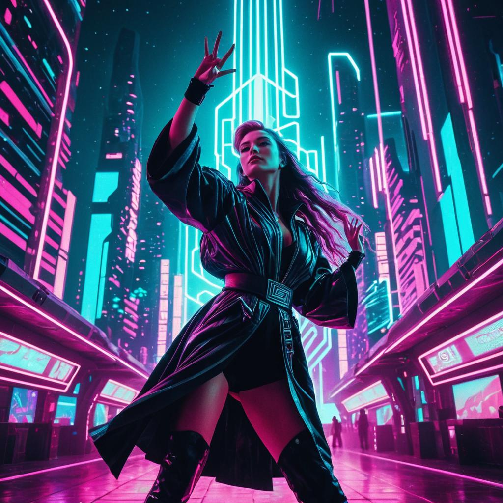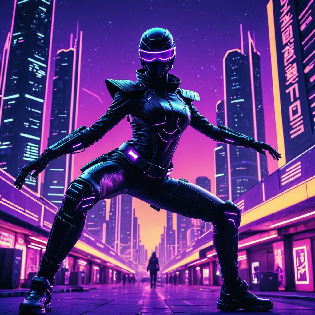 A beautiful cybernetic samurai in a dynamic pose in a retro futuristic synthwave cyberpunk neon paradise, cinematic glow, synthwave, cyber, futuristic city atmosphere.