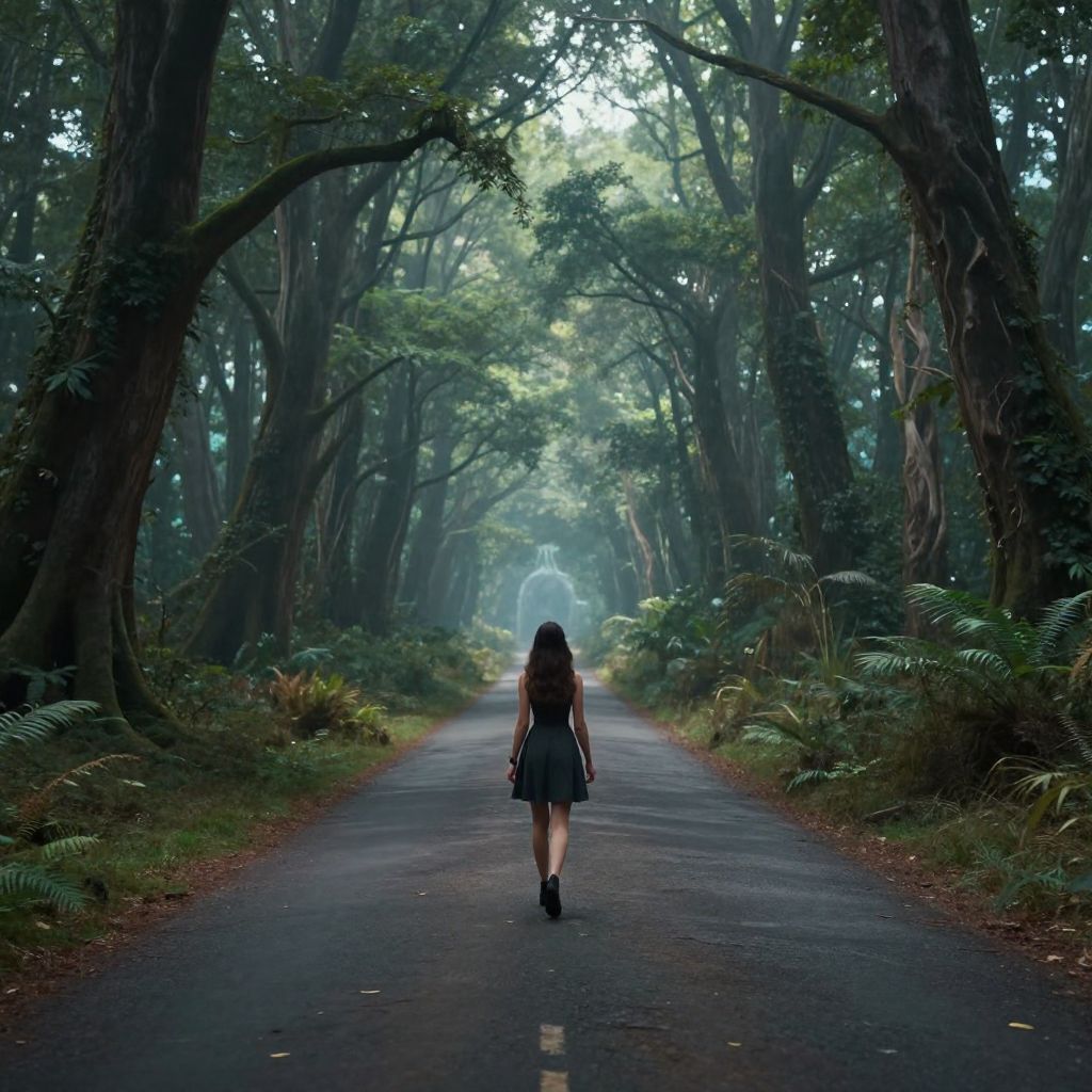 Wide-Angle Shot distance view, the back view of a woman walking down a road in a magical forest, fantasy, ethereal atmosphere, 8k, unreal engine, cinematic lighting, ultra detailed,