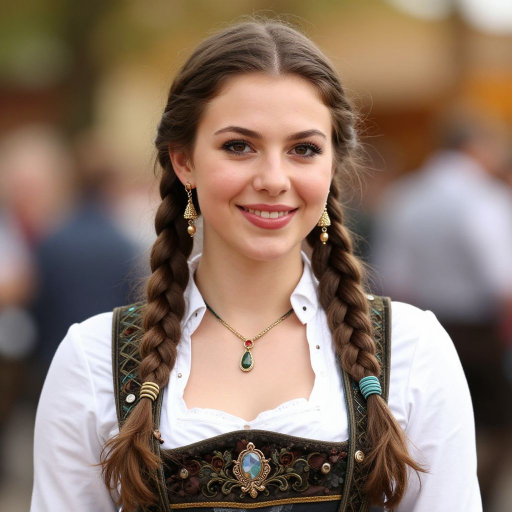 Photograph of an African-American woman with long black hair, wearing a traditional Bavarian dirndl dress, white lace off-shoulder sleeves, and