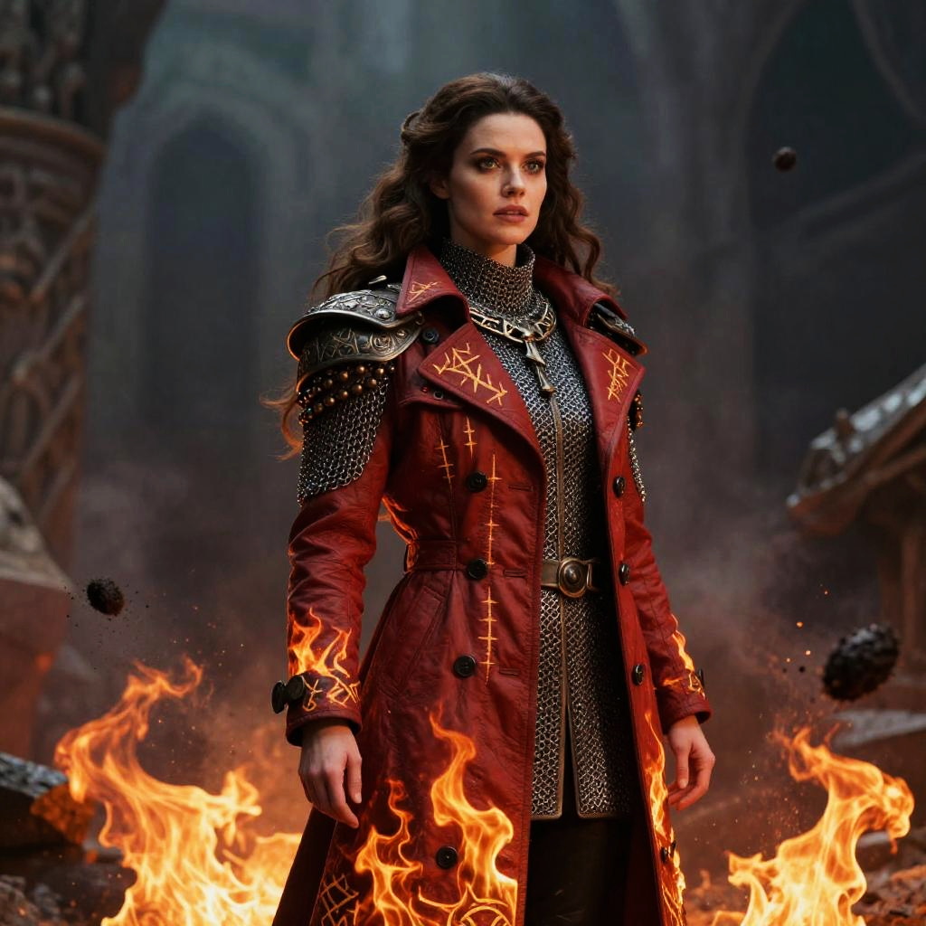 Portrait of a woman dressed as an epic warrior wearing a red trench coat with intricate runic engravings and chainmail armor. The detailed armor features metallic shoulder pads with decorative studs and a belt. She stands confidently amid flames and floating embers in a dark, ancient dungeon-like setting. Her long wavy hair and intense gaze emphasize the fantasy and medieval aesthetic, reminiscent of high-fantasy themes such as Dungeon & Dragons or Game of Thrones.