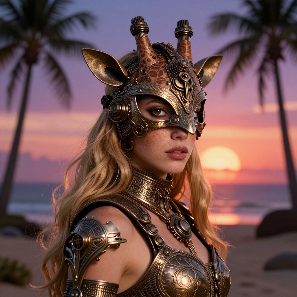 The image depicts a striking 3/4 length portrait of a beautiful young woman with freckles and long, flowing blond hair. She is adorned with an intricately designed giraffe mask, featuring elaborate metalwork and mechanical elements that give it a futuristic, steampunk aesthetic. Her eyes are a striking shade of brown, adding to her captivating appearance. The woman is wearing a detailed, metallic outfit that complements the mask, with intricate patterns and textures that enhance the overall steampunk theme. The background is a surreal, fantastical beach scene with palm trees and a distant, unreal sunset, bathed in volumetric lighting that creates a dramatic and otherworldly atmosphere. The composition is carefully arranged, with the woman positioned centrally, her body slightly angled to the viewer, and the background elements receding into the distance, creating a sense of depth and perspective. The entire scene is rendered with insane detail, making it appear almost photorealistic, and the high-octane render and cinematic lighting further enhance the visual impact.