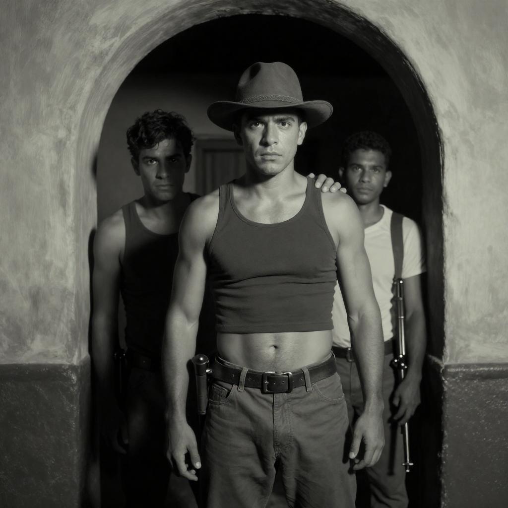 Black-and-white photograph of a tense scene from "Capitan Tormenta" directed by Guillermo Torre. Three men, one in a hat, stand in a dimly lit, arched doorway. The man in the center is muscular, wearing a crop top and pants, with a serious expression. Another man leans over his shoulder, while a third man in the background holds a rifle. The image has a green tint and a dramatic, suspenseful atmosphere.