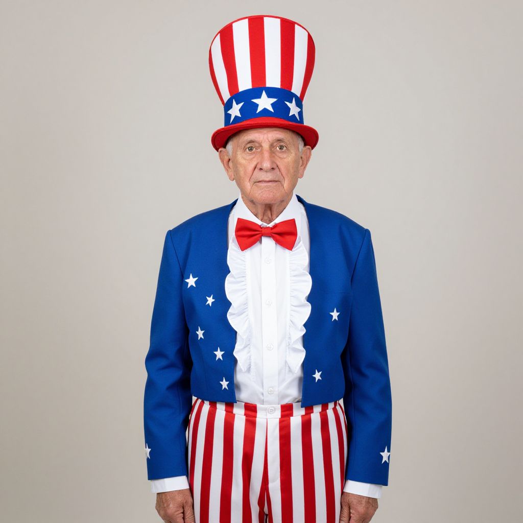 An elderly man wearing a vibrant patriotic costume featuring a tall hat with red and white stripes and white stars on a blue band, matching his blue jacket adorned with white stars and red-and-white striped pants. The formal outfit is completed with a ruffled white shirt and a red bow tie, set against a simple, neutral background that highlights the detailed attire.
