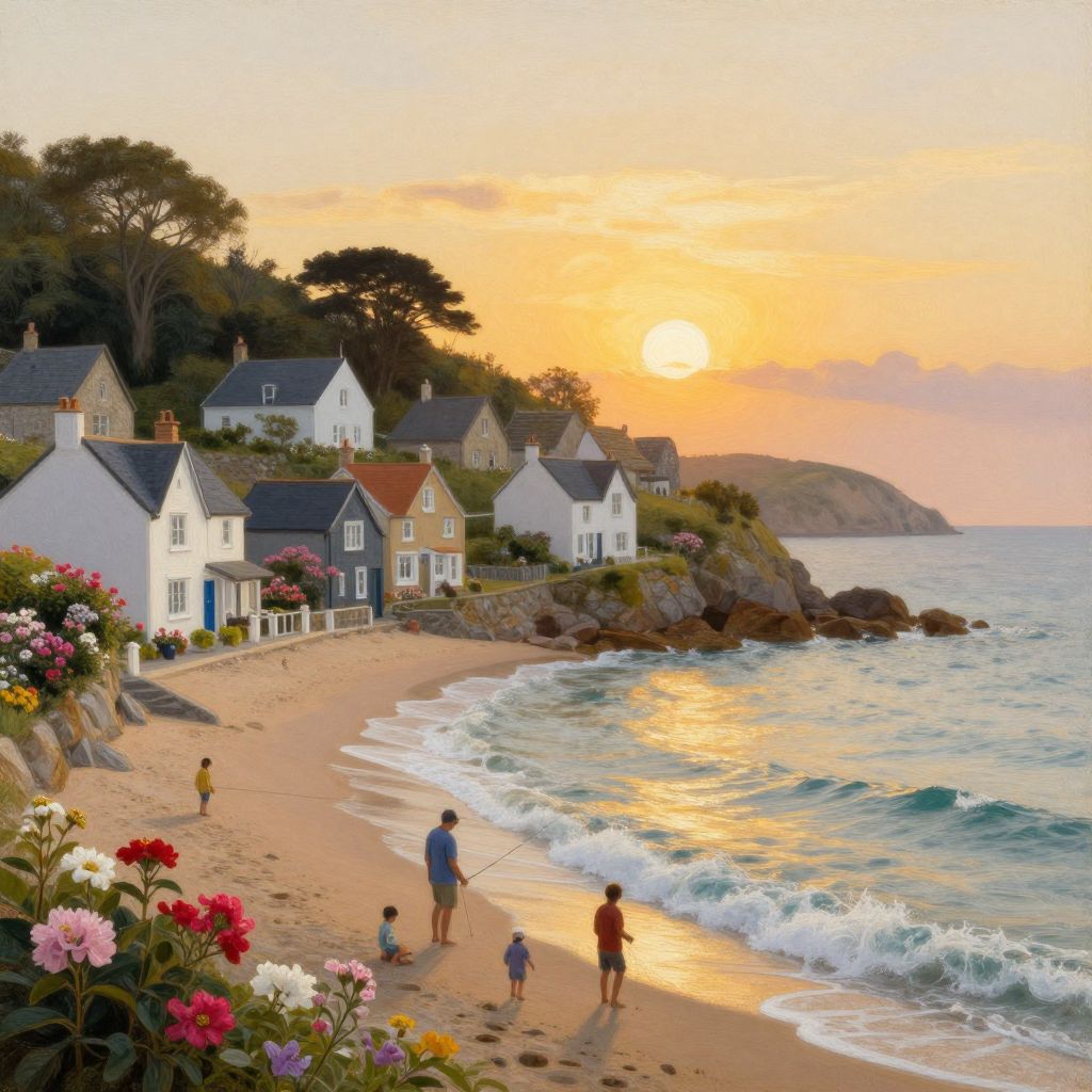 Merr serene coastal village under a golden sunset, quaint cottages with blooming flowers, gentle waves lapping against the shore, locals fishing and children playing, warm and inviting palette, detailed and realistic painting style