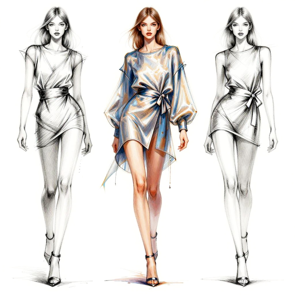 Free AI sketch generator illustrating fashion design sketches with flowing lines and dynamic poses, minimal color splashes on white backgrounds, highlighting texture and movement in fabrics, digital brush strokes mimicking traditional pencil and charcoal effects.