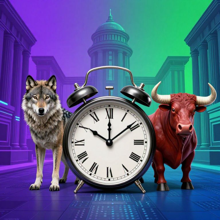 The background is a vibrant mix of colors, with shades of purple, green, and blue, creating a visually stimulating and dynamic atmosphere. The overall composition is balanced, with the clock serving as the central focal point, flanked by the wolf and the bull, and the architectural elements providing a sense of depth and perspective. The interplay of colors, textures, and shapes creates a rich tapestry that captures the essence of finance, economics, and technology, inviting the viewer to explore the complexities and nuances of these fields.