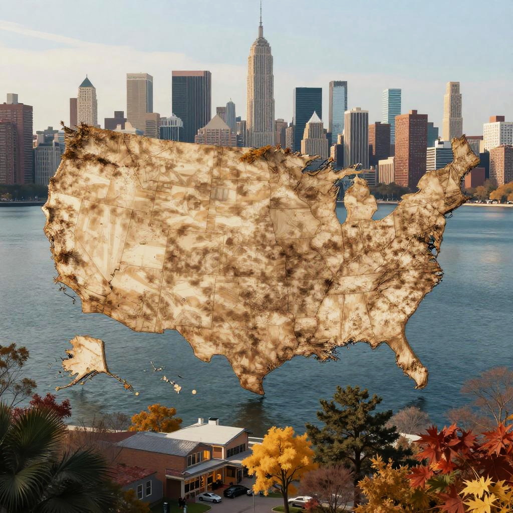 Artistic comparison of US landscapes using Stable Diffusion, winter versus summer settings, detailed foliage and urban designs, warm and cool tone contrast, ultra-detailed environment