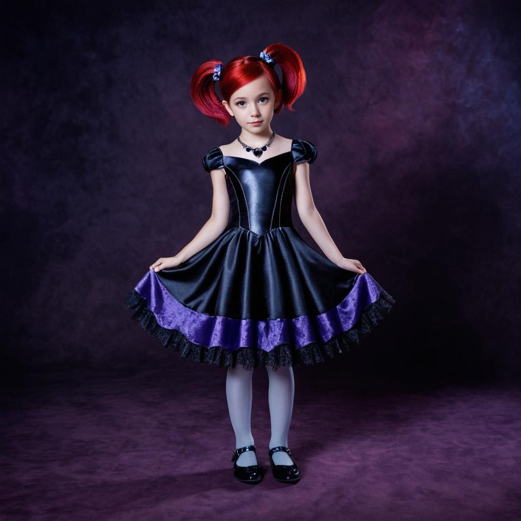 Nesting doll halloween,1girl, solo, dress, red hair, looking at viewer, red lips, bow, makeup, sitting, lipstick