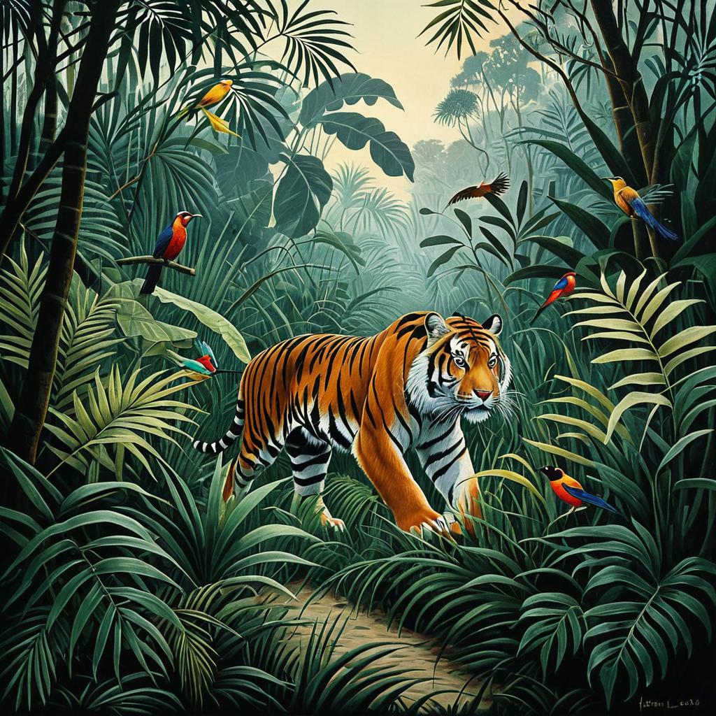 An artwork in the style of Henri Rousseau depicting a tiger prowling through a dense jungle at dawn. The scene is filled with lush green leaves and exotic colorful birds in flight. Morning mist and a rising sun create a mysterious and enchanting ambiance in the tropical forest.