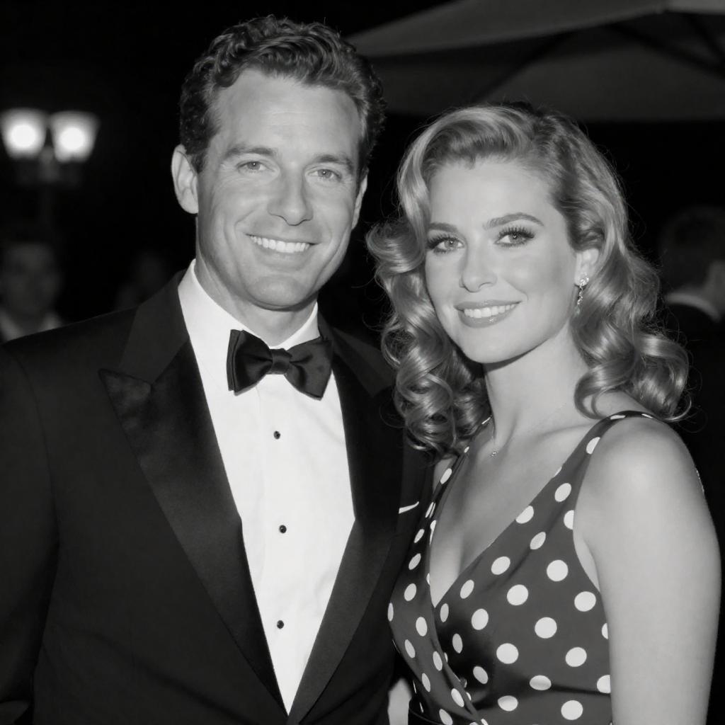 Photograph of a blonde woman in a black lace dress with pink accents, smiling and touching a man's chest. The man, in a dark pinstripe suit with a white shirt and red tie, looks at her. They are in a dimly lit room with blue and white lighting, reflected in glass panels behind them.