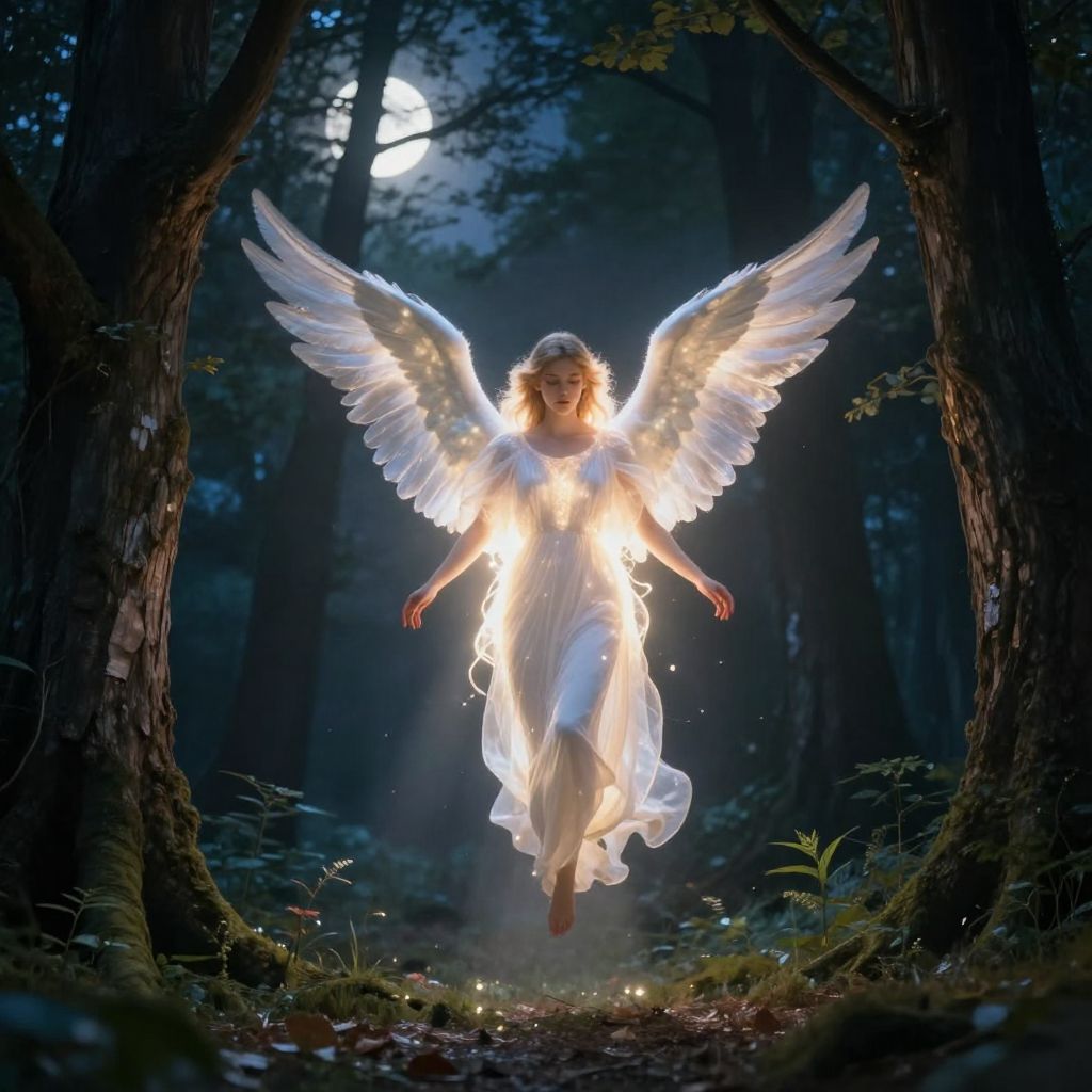 A guardian angel light floating above a moonlit forest clearing, radiant beams casting soft glows on ancient trees, angelic figure with luminous wings and serene expression, cinematic fantasy style.