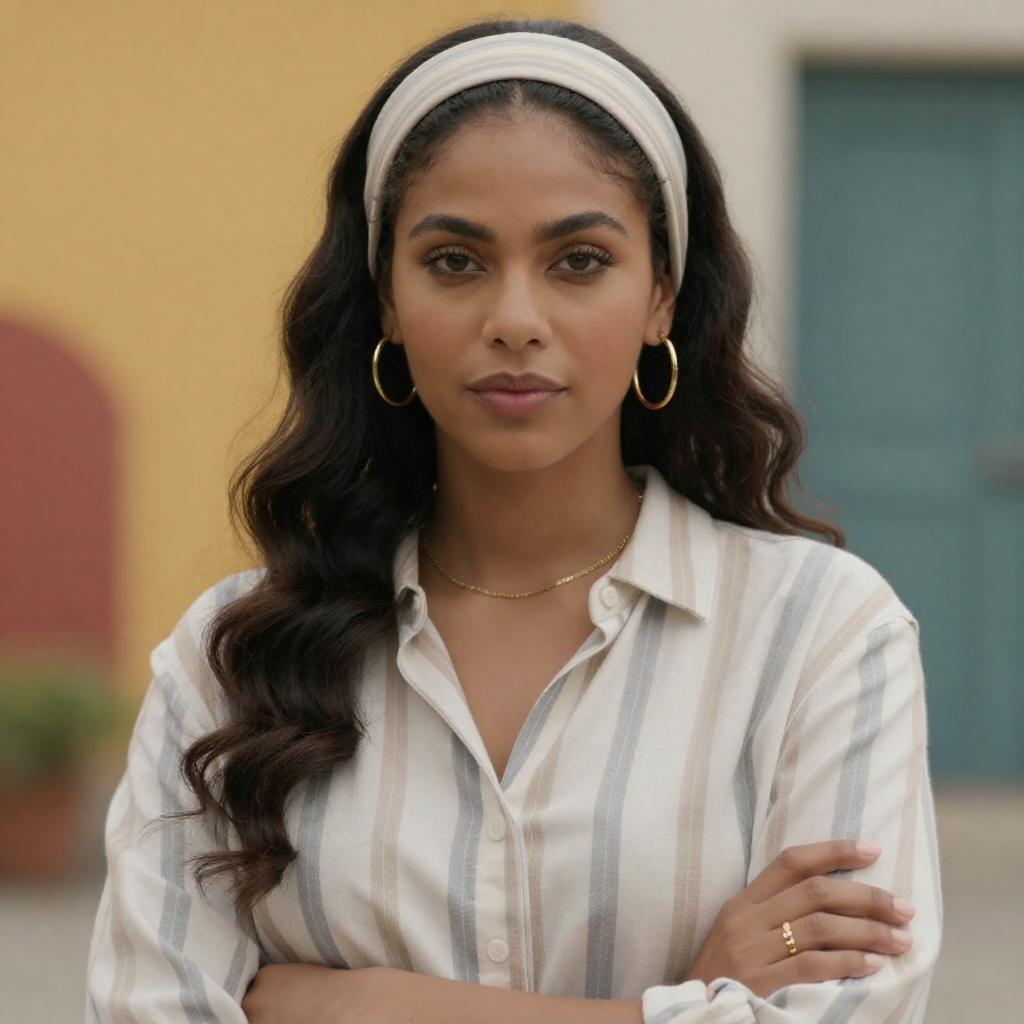 Photograph of a woman with medium brown skin and dark wavy hair, wearing a striped button-up shirt and matching headband. She has gold hoop earrings, a gold necklace, and a gold ring. Her arms are crossed, and she has a neutral expression. The background is blurred with bright colors.