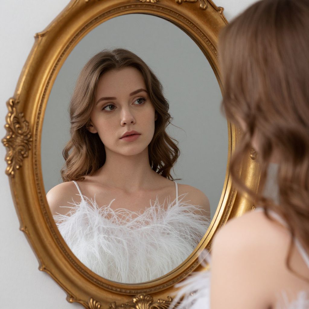 Photograph of a young, fair-skinned woman with light brown, wavy hair gazing at her reflection in an ornate, gold-framed oval mirror. She's wearing a white, feathered top that adds a soft, fluffy texture to the image. Her expression is calm and slightly pensive, with subtle makeup highlighting her natural features. The background is a simple, neutral gray, keeping the focus on her and the mirror.