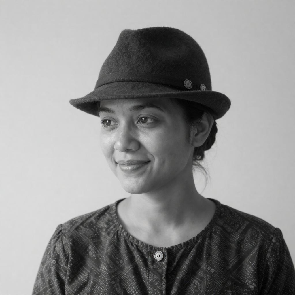 Photograph of a smiling woman with medium brown skin and long dark hair, wearing a green shirt, bound with yellow rope to two wooden posts. Her arms are raised above her head, and she looks to the right. The background is dark, highlighting the wooden ure and her bound position.