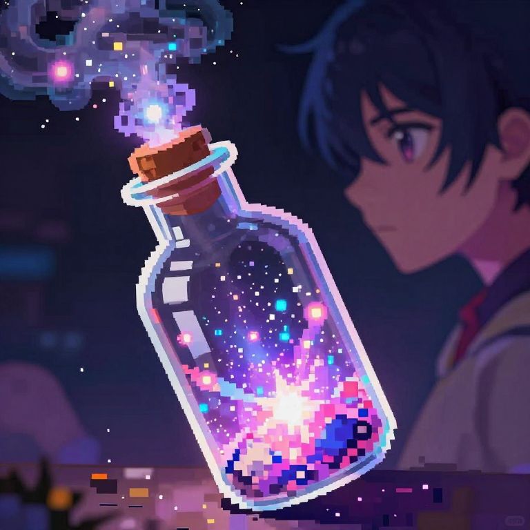 This digital anime-style drawing features a close-up of a glowing, pixelated glass bottle with a cork stopper. The bottle is filled with vibrant, colorful pixels, emitting a bright, blue and pink light. A pixelated smoke effect rises from the cork. In the background, to the right, is a young anime boy with dark blue, slightly messy hair and large, purple eyes, wearing a white shirt with a red collar. The dark, starry background contrasts with the bright, pixelated bottle. The image has a neon, futuristic vibe with a pixel art aesthetic.