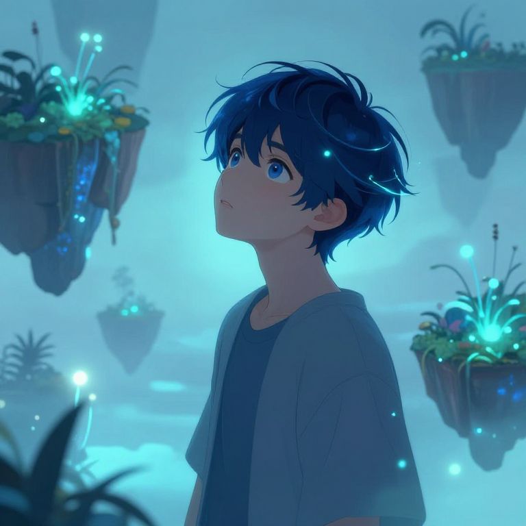 Digital anime-style artwork of a glowing, pixelated bottle with colorful sparks, floating in front of a blue-haired, wide-eyed boy in a dark background