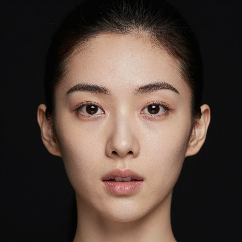 Photograph of a young East Asian woman with fair skin, dark brown hair pulled back, and large, expressive brown eyes. Her face is centered against a solid black background, highlighting her smooth complexion and subtle makeup. She has well-defined eyebrows, slightly parted lips with a natural pink hue, and a gentle, neutral expression. The lighting is soft, casting minimal shadows, and emphasizing the natural texture of her skin. The image has a realistic, high-definition quality, capturing fine details and a lifelike appearance.