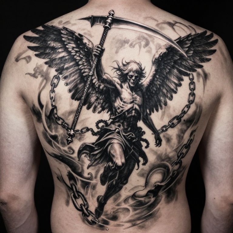 Dynamic and intense back tattoo featuring the angel of death in mid-flight, wings spread powerfully, gripping a luminous scythe, surrounded by swirling shadows and ethereal chains, combining realism with dark fantasy elements and high-contrast black and grey tones.